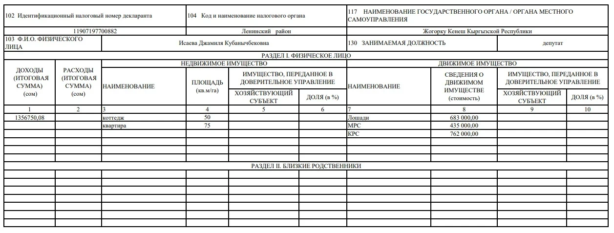 The vice-speaker Jamila Isaeva declared an income of 1 million 356 thousand 750 soms. She owns a cottage with an area of 50 square meters, an apartment with an area of 75 square meters, as well as horses worth 683 thousand soms, sheep worth 435 thousand soms, and cattle worth 762 thousand soms.