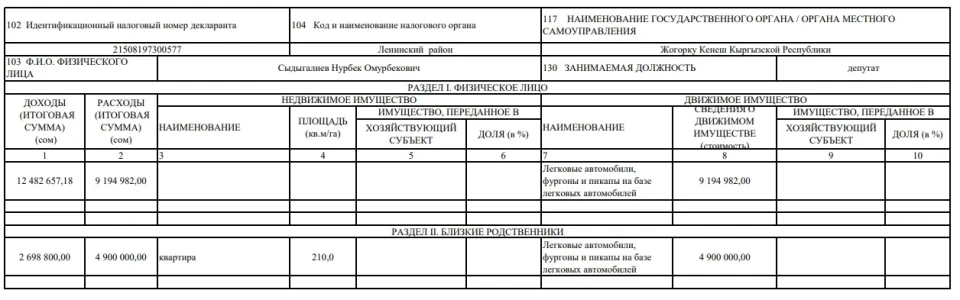 The close relatives of Sydygaliev reported income of 2 million 698.8 thousand soms, with expenses of 4.9 million soms. They own an apartment with an area of 210 square meters and vehicles worth 4.9 million soms.