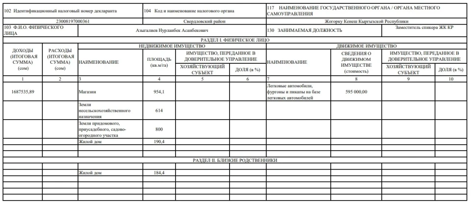 The vice-speaker Nurlanbek Azygaliev declared an income of 1 million 687 thousand 535.89 soms, but no information about expenses was provided. He owns a store with an area of 954 square meters, a residential house with an area of 190 square meters, cars worth 595 thousand soms, as well as land plots for general use with areas of 614 and 800 square meters.