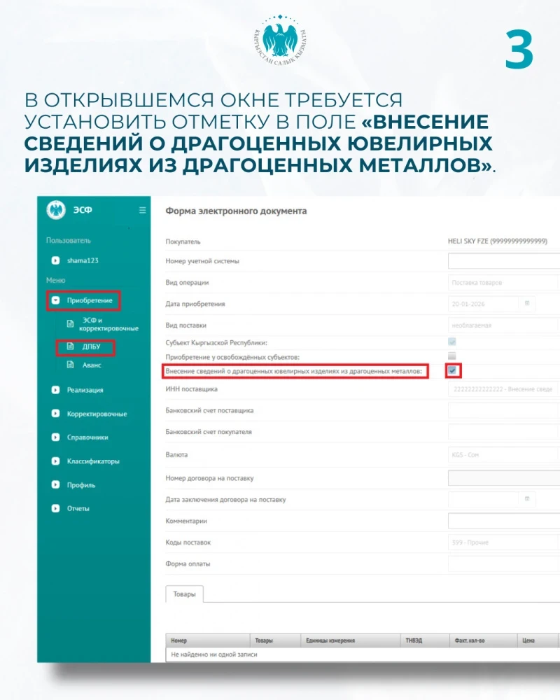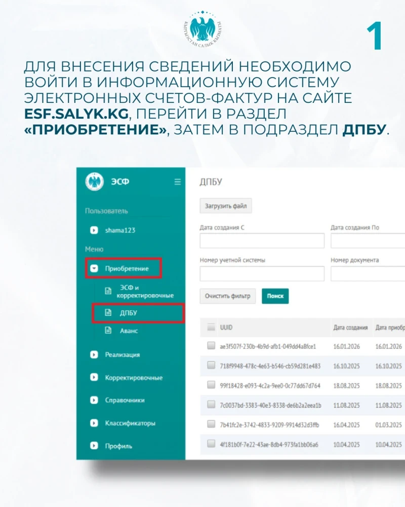 - First, you need to log into the electronic invoice information system at the website esf.salyk.kg and go to the "Acquisition" section, then to the DPBU subsection.