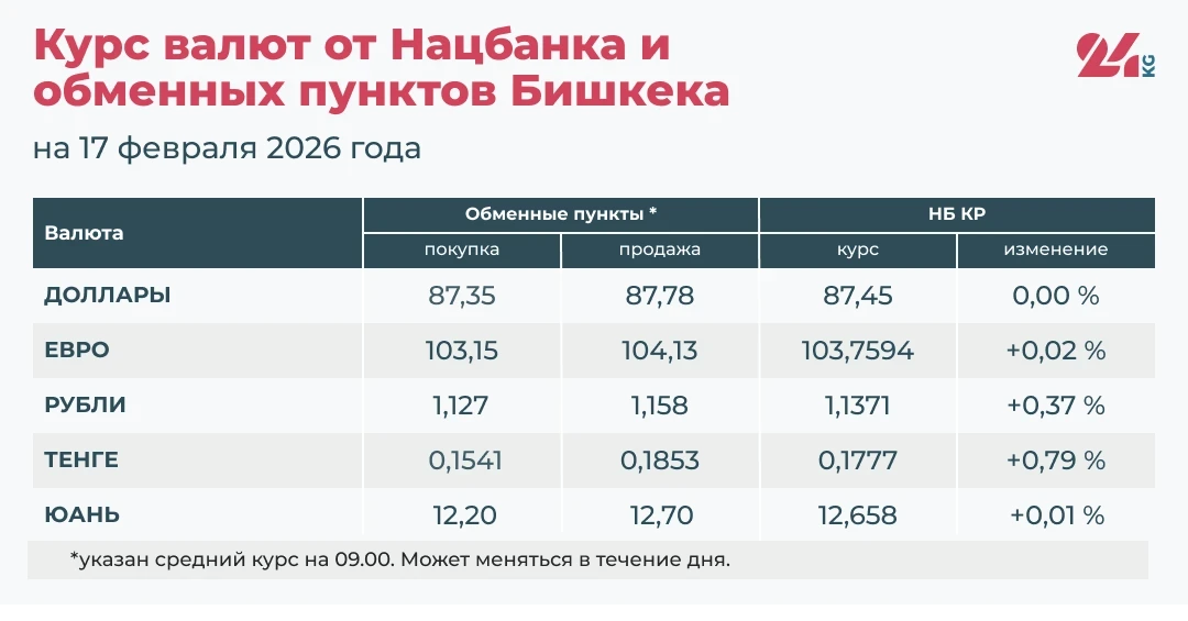 - Average exchange rate in exchange offices: buying — 87.35 soms, selling — 87.78 soms.