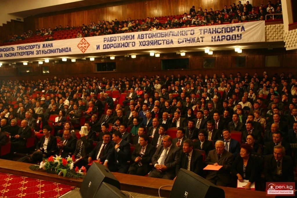 On October 24, 2014, at 2 PM, a ceremonial meeting dedicated to the Day of Workers of Road Transport and Road Economy took place at the Kyrgyz National Philharmonic. The program for this event included a visit and inspection by representatives of the Presidential Administration, the Government of the Kyrgyz Republic, and guests of the stands with information about the development of the industry in the foyer of the Kyrgyz National Philharmonic (left wing, 2nd floor), media interviews, and a screening of a film about the development of road transport and road economy in the Kyrgyz Republic. Following that, congratulatory speeches were delivered on behalf of the President of the Kyrgyz Republic, the Deputy Prime Minister of the Kyrgyz Republic, the Minister of Transport and Communications of the Kyrgyz Republic, and veterans of the industry. Distinguished employees of the Ministry of Transport of the Kyrgyz Republic were awarded departmental honors, and then a festive concert took place.