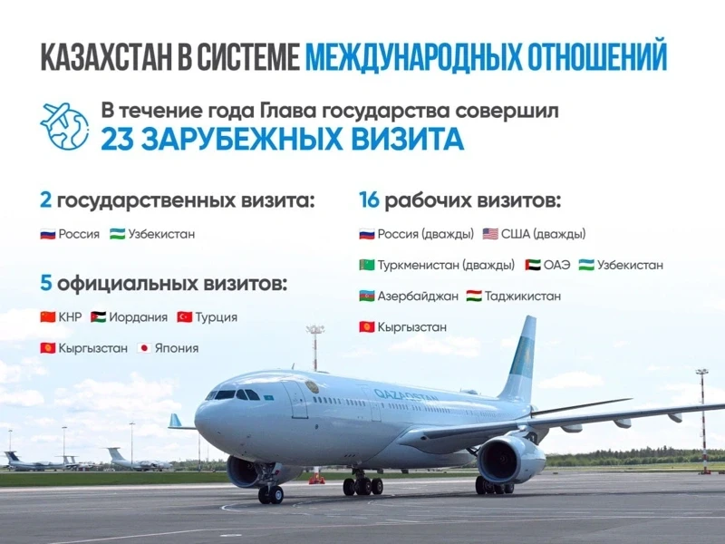 Throughout the year, Tokayev made 23 foreign visits, including two state visits to Russia and Uzbekistan, five official visits to China, Jordan, Turkey, Kyrgyzstan, and Japan, as well as 16 working visits to Russia (twice), the USA (twice), Turkmenistan (twice), the UAE, Uzbekistan, Azerbaijan, Tajikistan, and Kyrgyzstan.