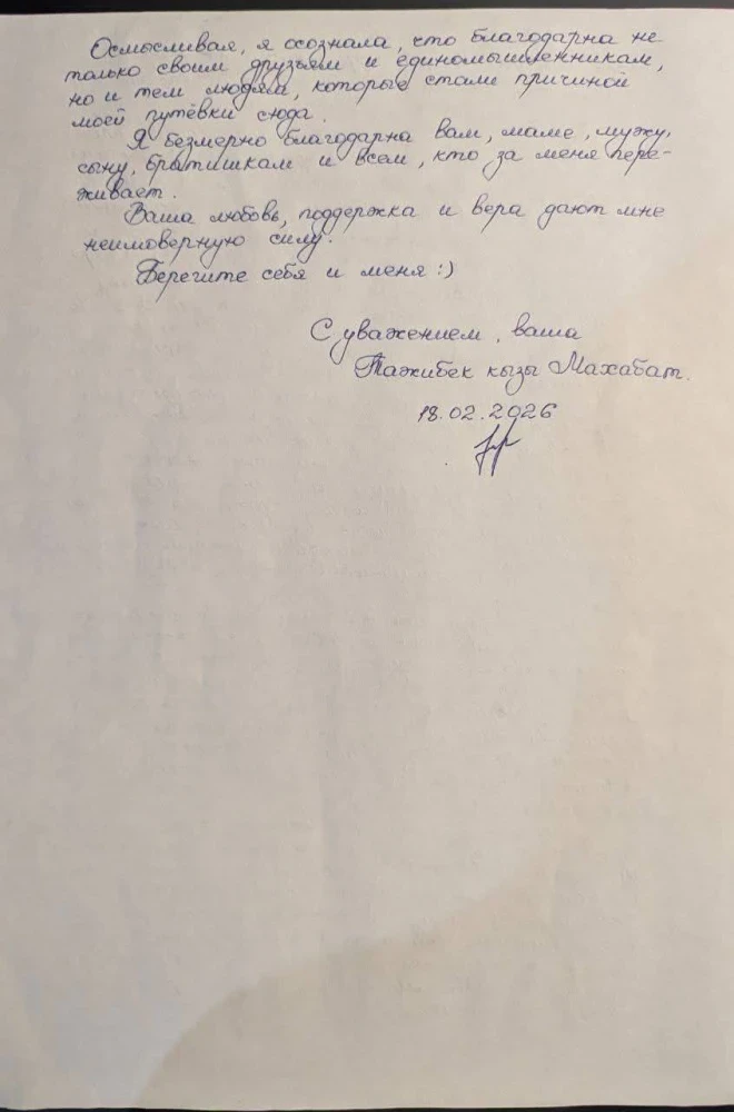 In 2026, the defense of Mahabat Tajibek kyzy filed a petition to reopen the case with new circumstances. The hearing of this petition is scheduled in the Supreme Court for March 10.