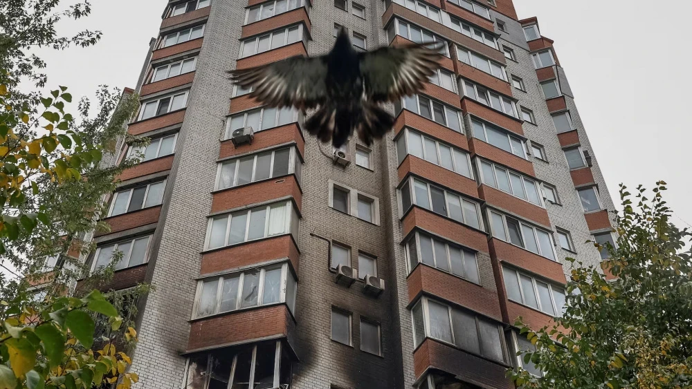 A dove against the backdrop of a damaged building in Kyiv after a drone attack. Photo by Alina Smutko / Reuters.