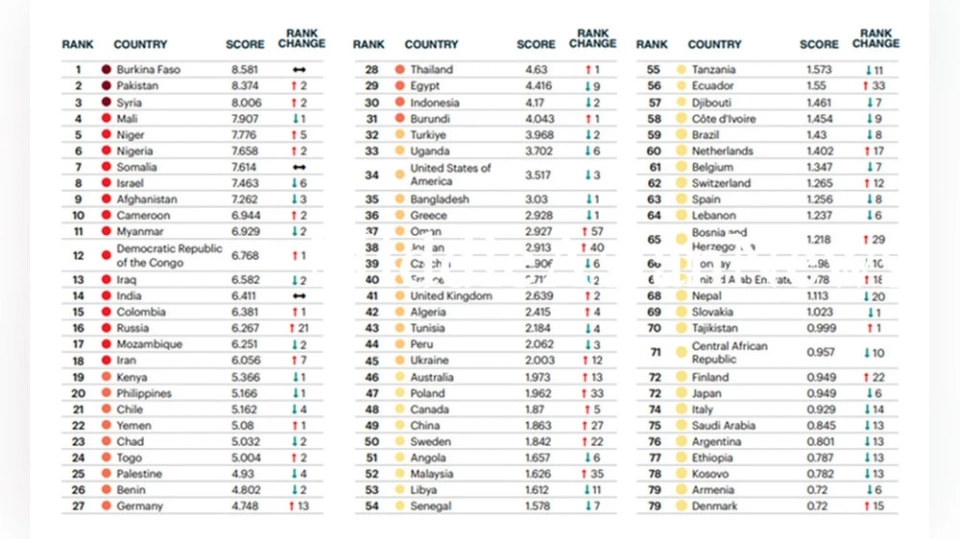The most dangerous regions according to the study were Burkina Faso, Pakistan, and Syria, followed by Mali, Niger, Nigeria, and Somalia.