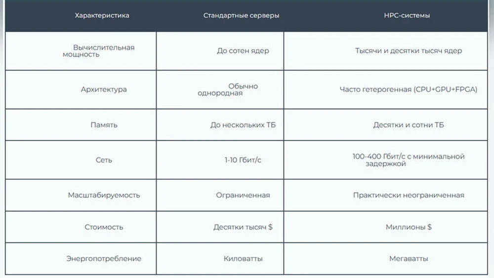 HPC systems are more than just "very fast computers." They are specialized complexes designed to solve problems that ordinary servers cannot handle or will do so extremely slowly.