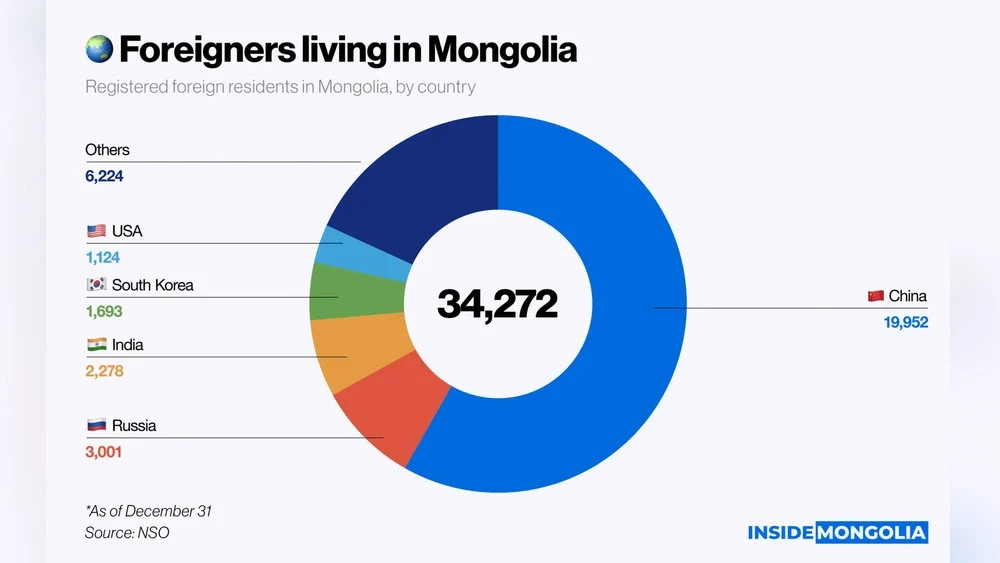 According to InsideMongolia, by the end of 2025, more than 34,000 foreigners from 136 countries are living in Mongolia. The increase in the number of foreign citizens by 7.4% compared to last year indicates stable growth rather than a temporary phenomenon.