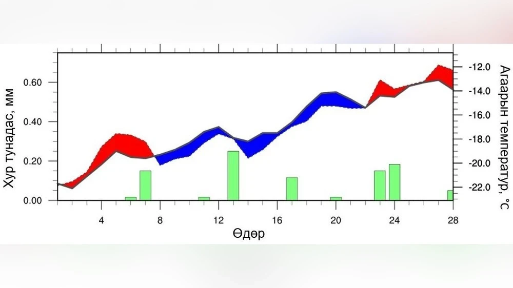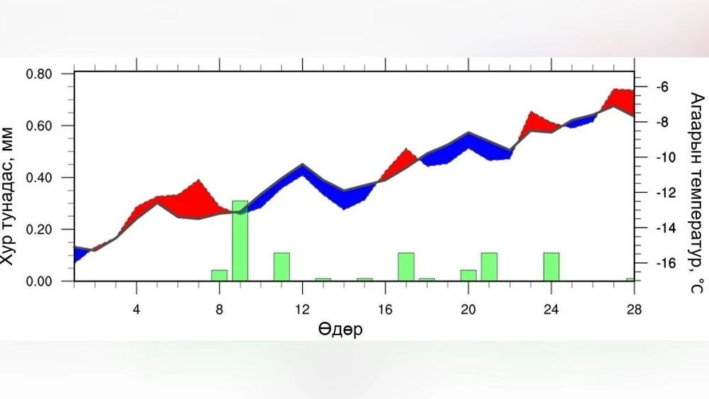 In the eastern aimags, it is expected that the average air temperature in February will be below the long-term level, while precipitation will be close to average levels in the southern part of Sukhbaatar and above average in other areas. The dynamics of temperature and precipitation are presented in Figure 9. At the beginning of the month, daytime temperatures will be above average, while by the end of the first ten days, in the beginning and middle of the second decade, as well as at the beginning of the third decade, temperatures are predicted to be 1–5 °C below long-term averages.