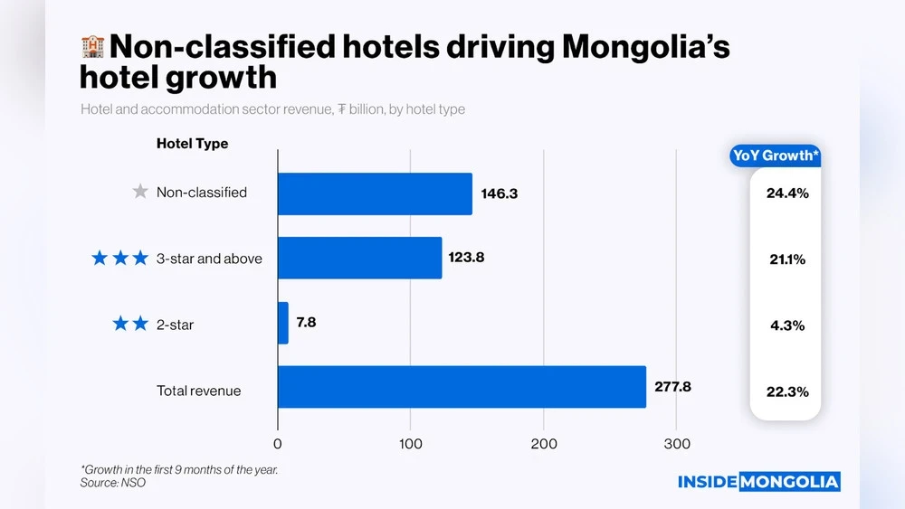 «The hotel and tourism service sector in Mongolia continues to show positive dynamics: according to the National Statistical Committee, the sector's revenue for the first three quarters of 2025 increased by 22.3% compared to the same period in 2024, reaching ₮277.8 billion,» reports InsideMongolia.