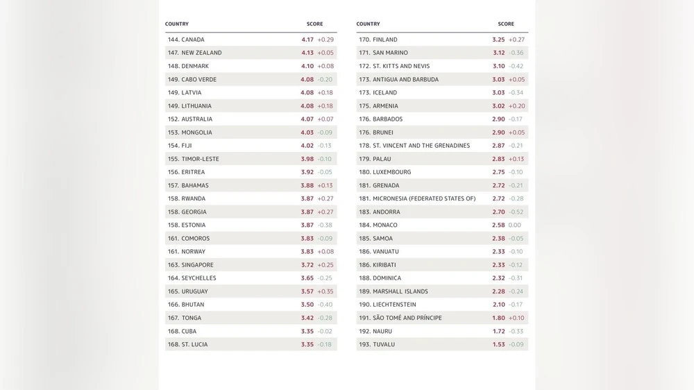 Compared to other countries, Mongolia ranked 153rd, behind Denmark (148), Latvia (149), Lithuania (149), and Australia (152).