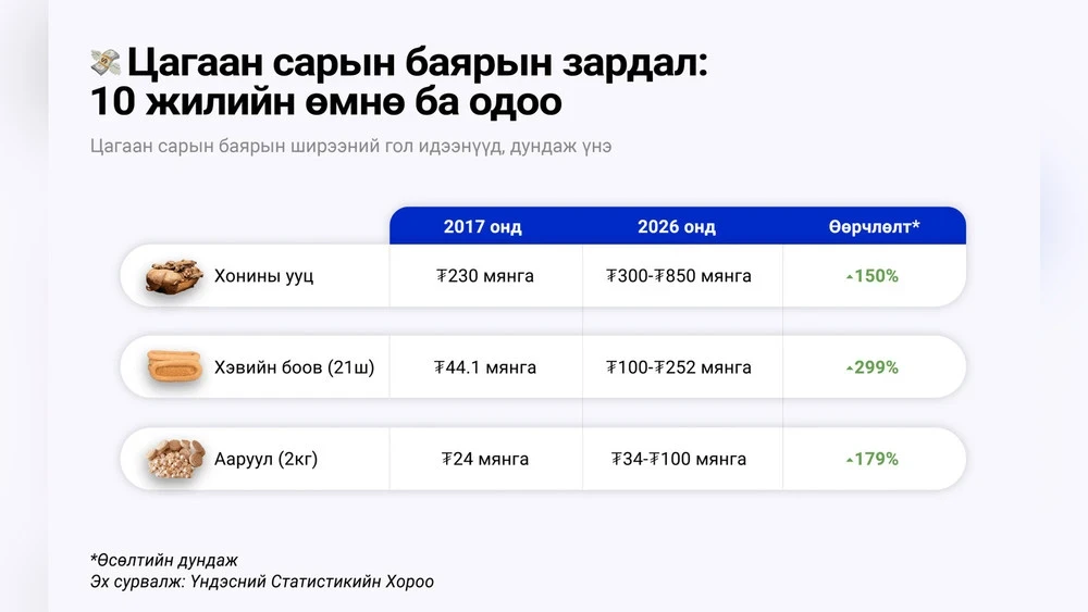 Compared to 2017, the prices for traditional dishes for the Tsagaan Sar holiday, such as uuts (lamb back), heviiin boov (Mongolian cookies for table decoration), and aaruul, khuruud (dried curds), have significantly increased. The average price of uuts has risen by 150% over the past 10 years, now ranging from ₮300 to ₮850 thousand (from $85 to $240). For 2 kg of aaruul, the price has increased by 179%, ranging from ₮34 to ₮100 thousand (from $10 to $28), while for heviiin boov, it has increased by 299%, with a range from ₮100 to ₮252 (from $28 to $71). This means that the price of heviiin boov has nearly tripled, the price of uuts has increased by 2.5 times, and aaruul has increased by 1.8 times.