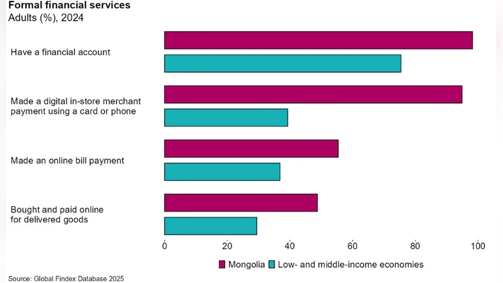 As of 2024, 95% of Mongolia's adult population makes digital payments in stores using cards or smartphones, more than half shop and pay for goods online, and 70% pay utility bills directly from their accounts.