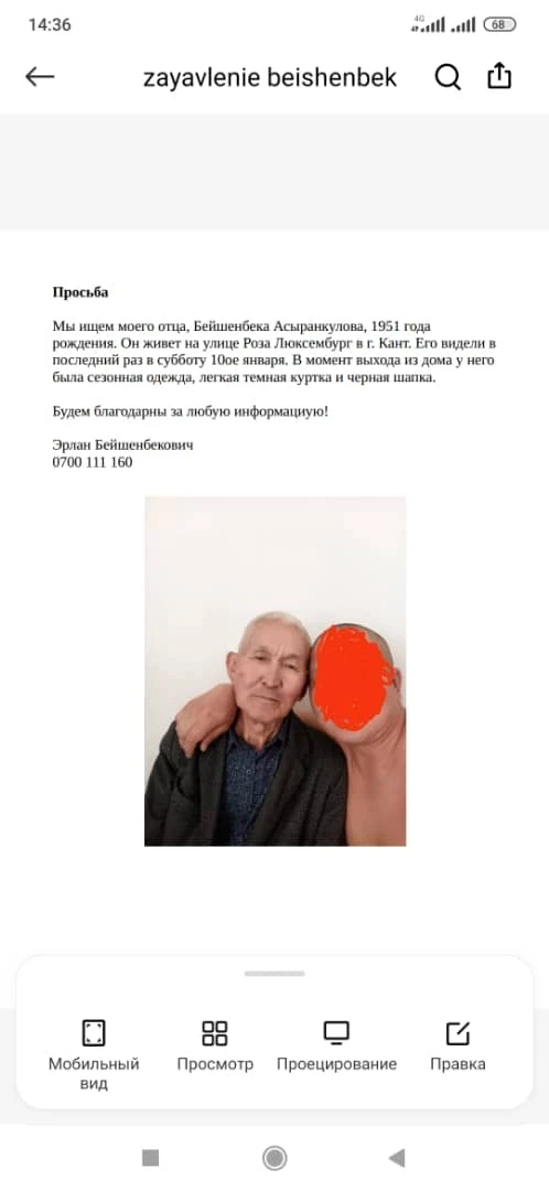 Law enforcement agencies are appealing to anyone who may have information about the whereabouts of Beishenbek Asyrankulov to immediately contact the Issyk-Ata district police department.
