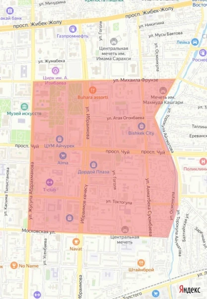 The area affected by the shutdown includes districts bounded by Osmonkula Street – from Chuy Avenue to Jibek Jolu Avenue, as well as Moscow, Ibraimov, and Frunze streets.