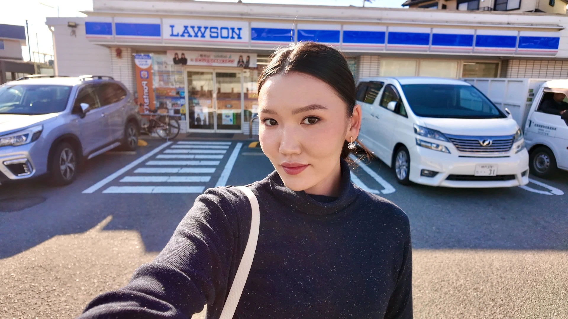 Photo of Aizhan Askarbekova. Against the backdrop of a famous Japanese grocery store