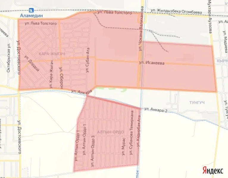 According to information from the city authorities, the shutdown will affect the area bounded by the streets: Dostoevsky, Ankara, Auezov, and the railway line. The residential areas of "Alty-Ordo," "Kara-Jyach," and "Police Town" will also be in the shutdown zone.
