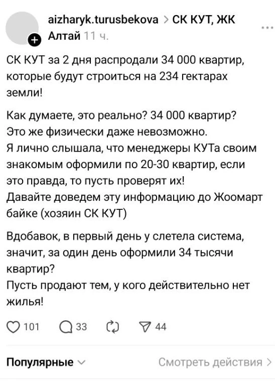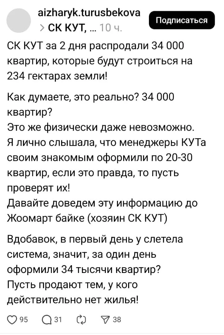The founder of the real estate sales company OSK and blogger Baktiyar Kasymaliev expressed the opinion that it is important to consider the company's calculations and construction conditions in this matter.