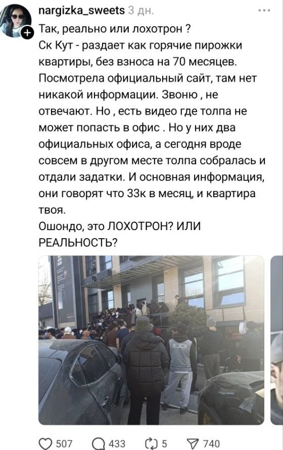 The promotional materials state that apartments for self-finishing are offered at a price starting from $900 per square meter, with commissioning planned in 3.5 years. According to calculations, the monthly payment for a one-bedroom apartment of 29 square meters will be about 32,260 soms, while for a two-bedroom apartment of 50 square meters it will be about 55,600 soms.On social media, users express doubts about this promotion.