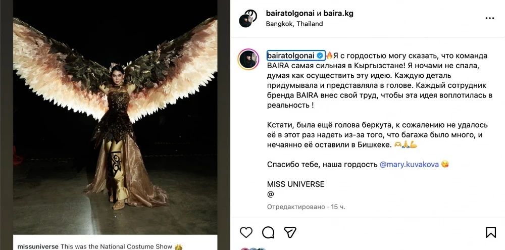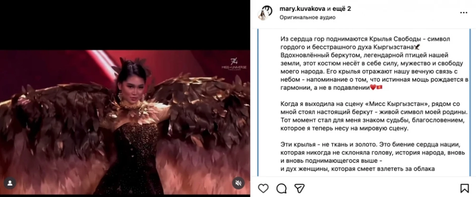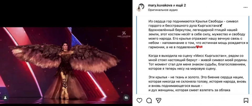 According to Mary Kuvaakova, the golden eagle symbolizes not only strength and freedom but also the pride of the Kyrgyz people. "When I spread these wings, I tell our story, about the resilience and dignity that live in each of us," she shares on her Instagram.