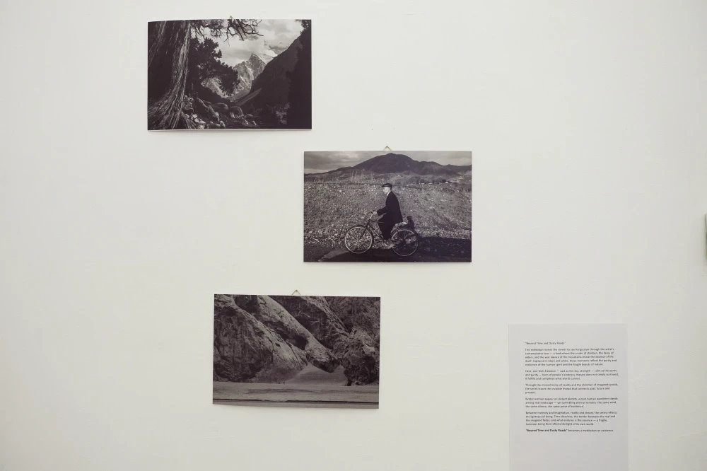 According to Khasanova, "I aimed to blur the boundaries between time – the past, present, and future. This series reflects my travels across Kyrgyzstan and shows how deep an impact sincere smiles of people and the diversity of natural states leave. Through a monochrome reality and shimmering imaginary worlds, I wanted to connect the past with the future and the present. Kyrgyz women appear on distant planets, while a traveler from the post-humanist era finds himself against the backdrop of real landscapes of Kyrgyzstan. In all of this, there is something eternal: the same wind, the same silence, and the same rhythm of existence. This exhibition is about the light that carries its origin."