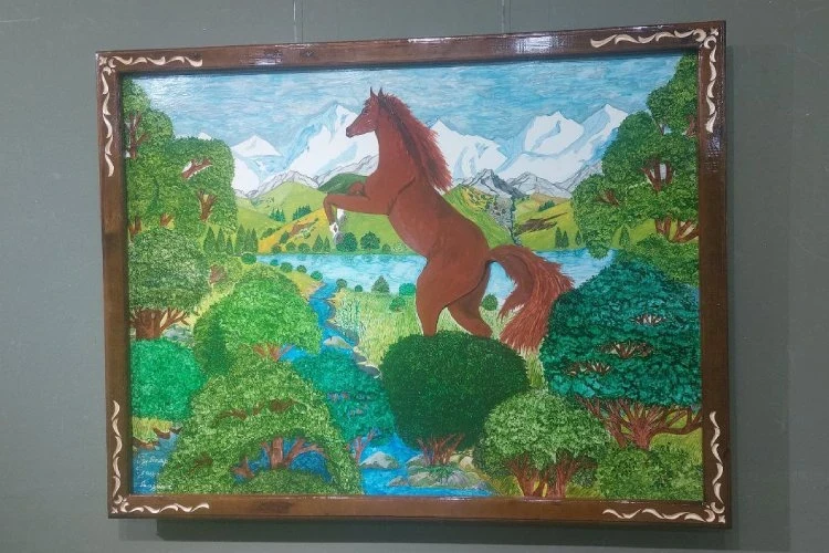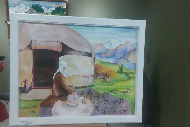 The canvas depicts a woman by a yurt, preparing food and waiting for her son’s return. The artist noted that thanks to creativity, his time in prison passes more easily.