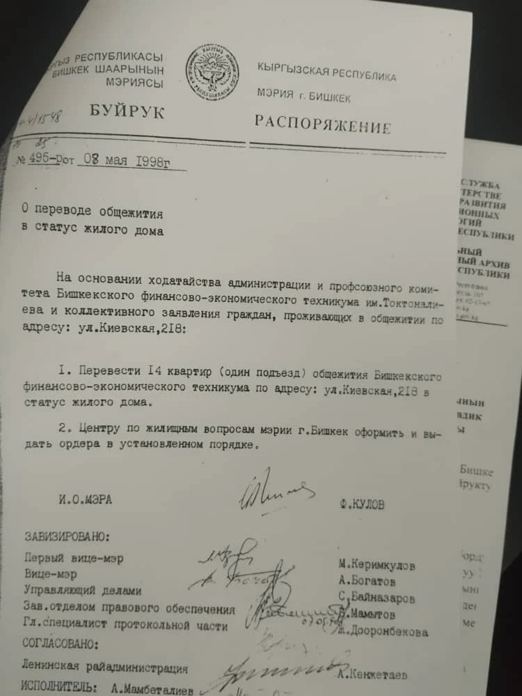 According to the residents, the Bishkek city hall issued an order to change the status of the premises to residential apartments. As a result, technical passports were issued for 15 apartments, and they became private property. "We acted in accordance with the law, we have all the necessary documents," the residents claim.