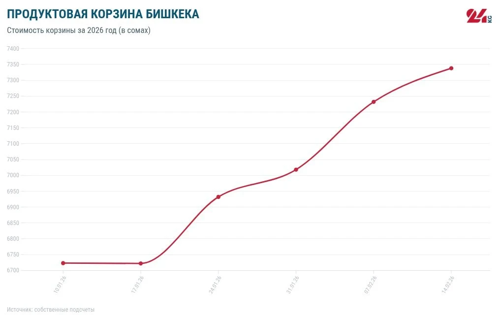 Since the start of our monitoring in late October 2018, the cost of the grocery basket has increased by 4,068 soms. Since the beginning of this year, the increase has been 615 soms, and compared to the same period in 2025, it has risen by 1,272 soms.