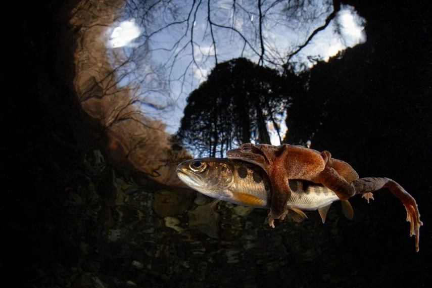 The Japanese brown frog, which inhabits the mountains until November, then descends into local rivers for hibernation. Males, seeking to mate, cling to anything that floats by, including yamame trout.