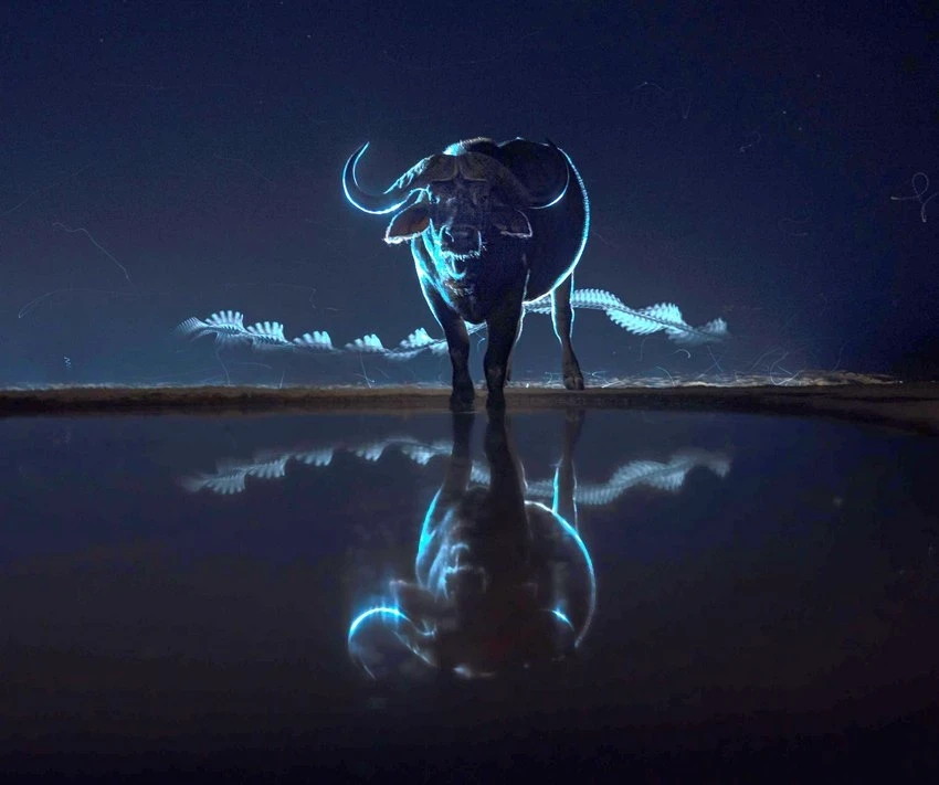 The photographer carefully waited for the African buffalo to reflect in the dark water, creating a glowing effect that highlighted the curve of its horns. A long exposure captured a bat that appeared as a ghostly shape in flight.