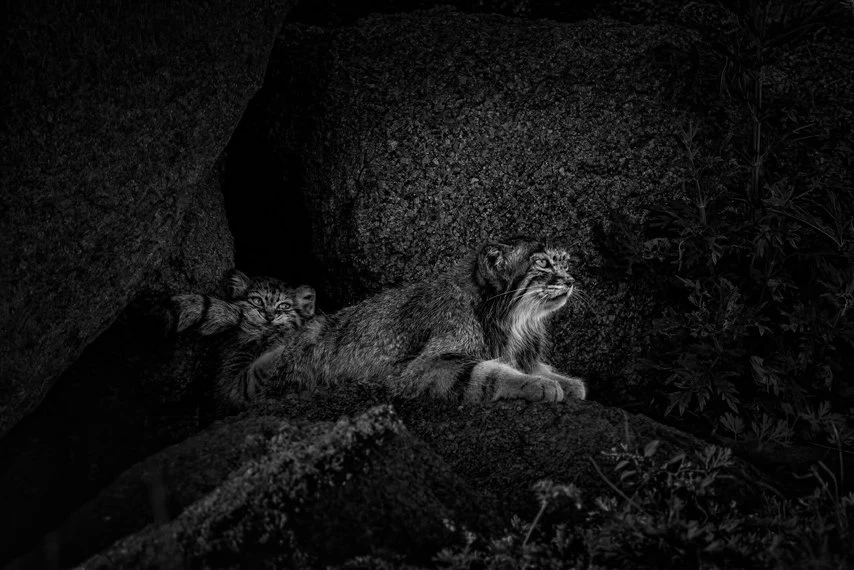 After a morning of play, the mother Pallas's cat returned with prey. The fastest of the kittens managed to catch a rodent. This shot captures the individuality of the little one beginning to show through its bright and mischievous eyes.