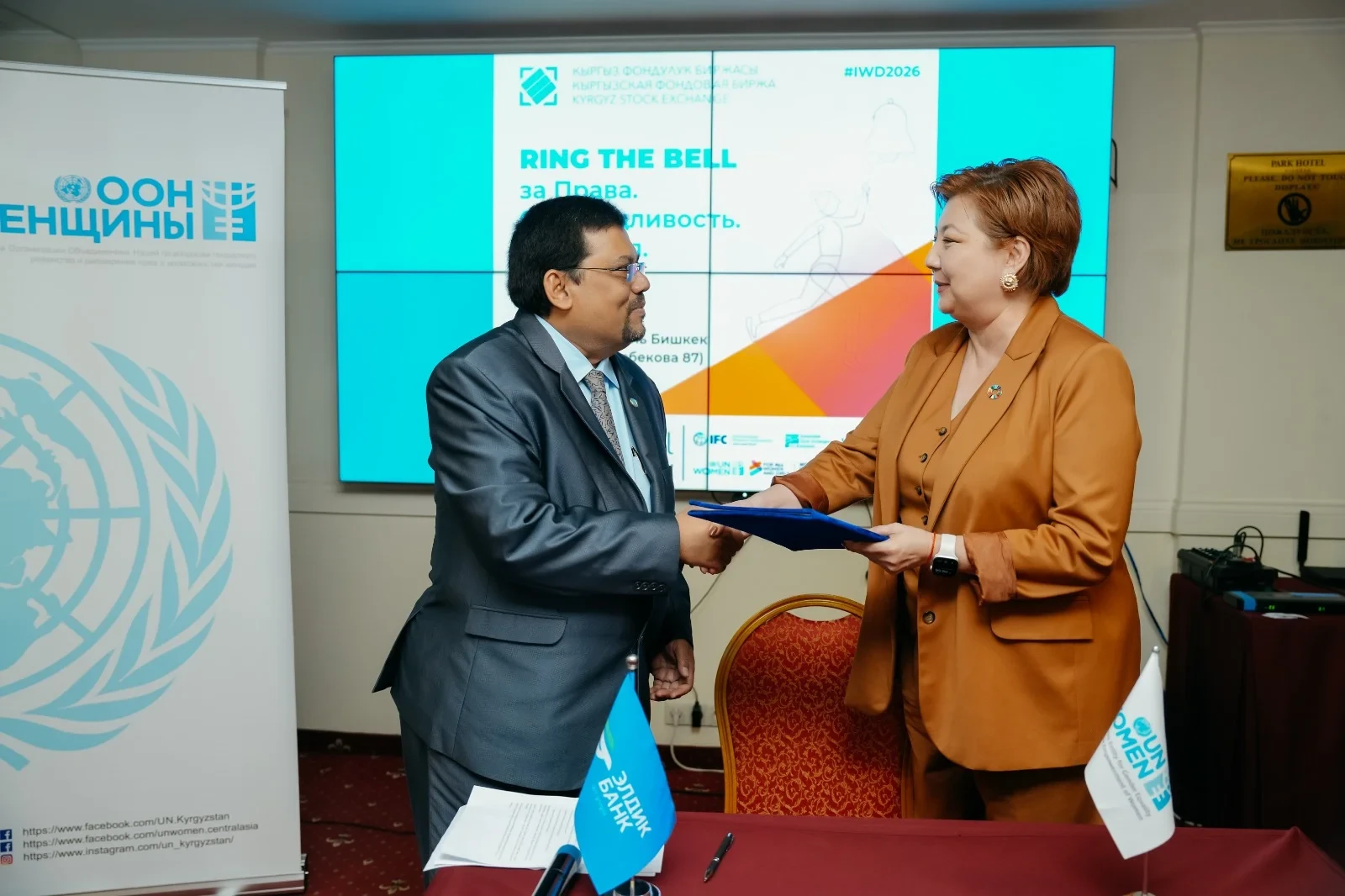 The culmination of the meeting was a ceremonial gong strike and the signing of commitments to the principles of women's empowerment between Said Sadik, Chair of UN Women in Kyrgyzstan, and Aichurek Jakypova, Chair of the Board of JSC "Eldik Bank."