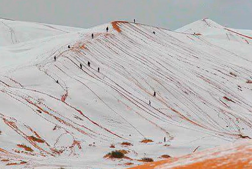 The snow cover blanketed the bright orange dunes, and local residents, as well as tourists, took the opportunity for outdoor activities, snowboarding and sledding down the snowy slopes.