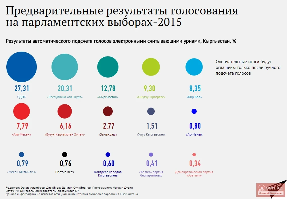 The final results will be announced only after the manual counting of votes. A total of 2 million 761 thousand 297 voters, who submitted biometric data, were eligible to vote in the elections to the Jogorku Kenesh.