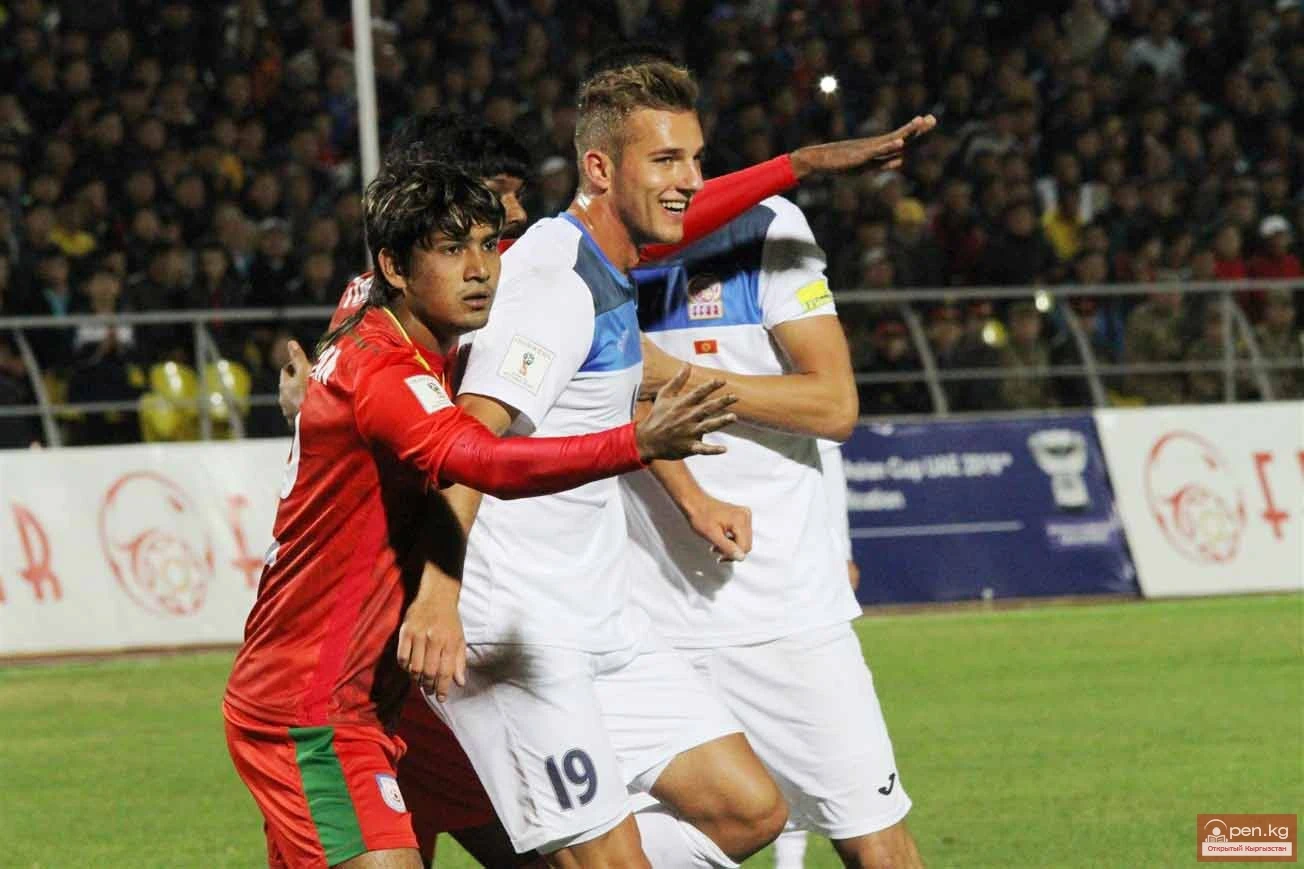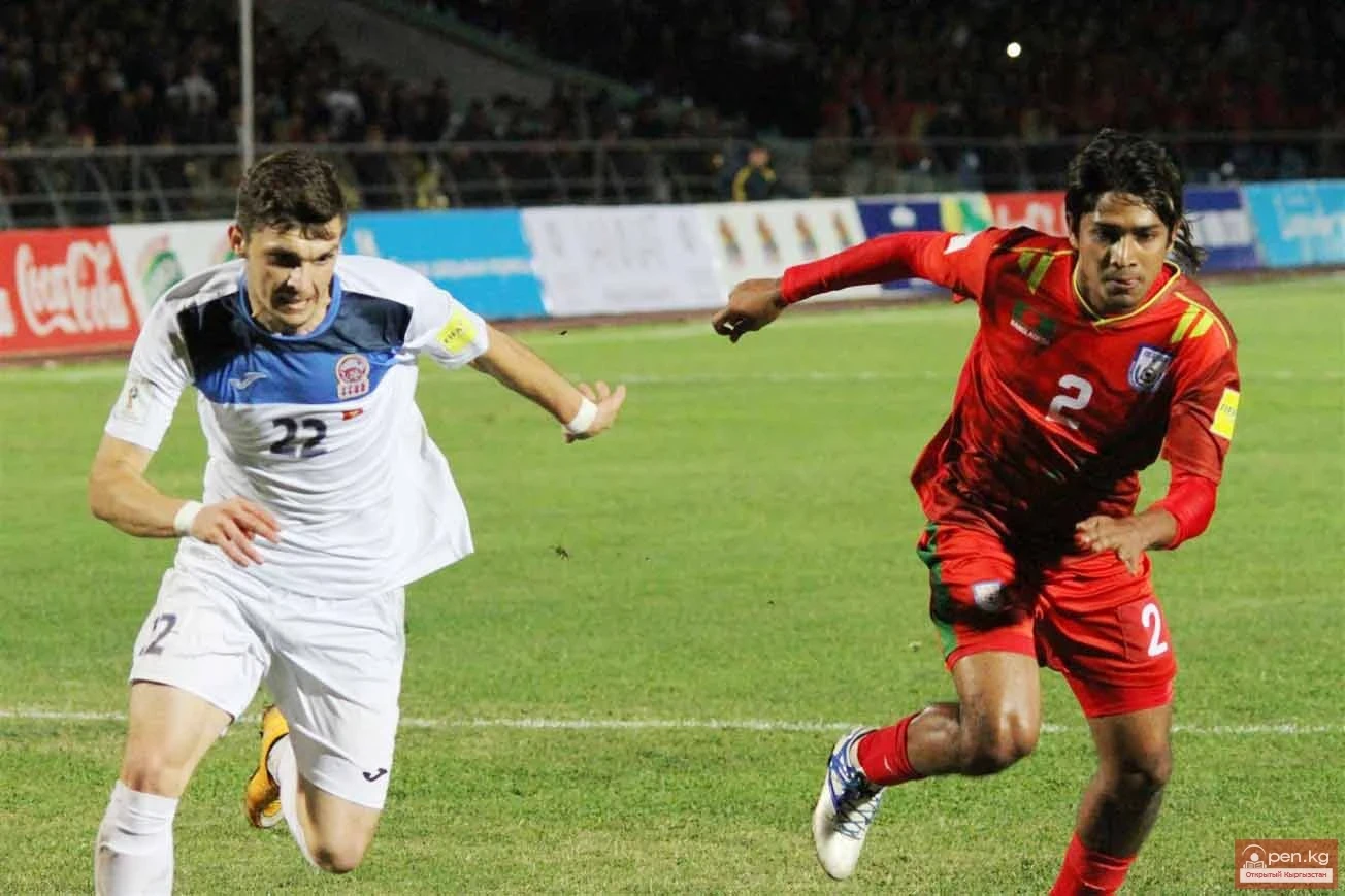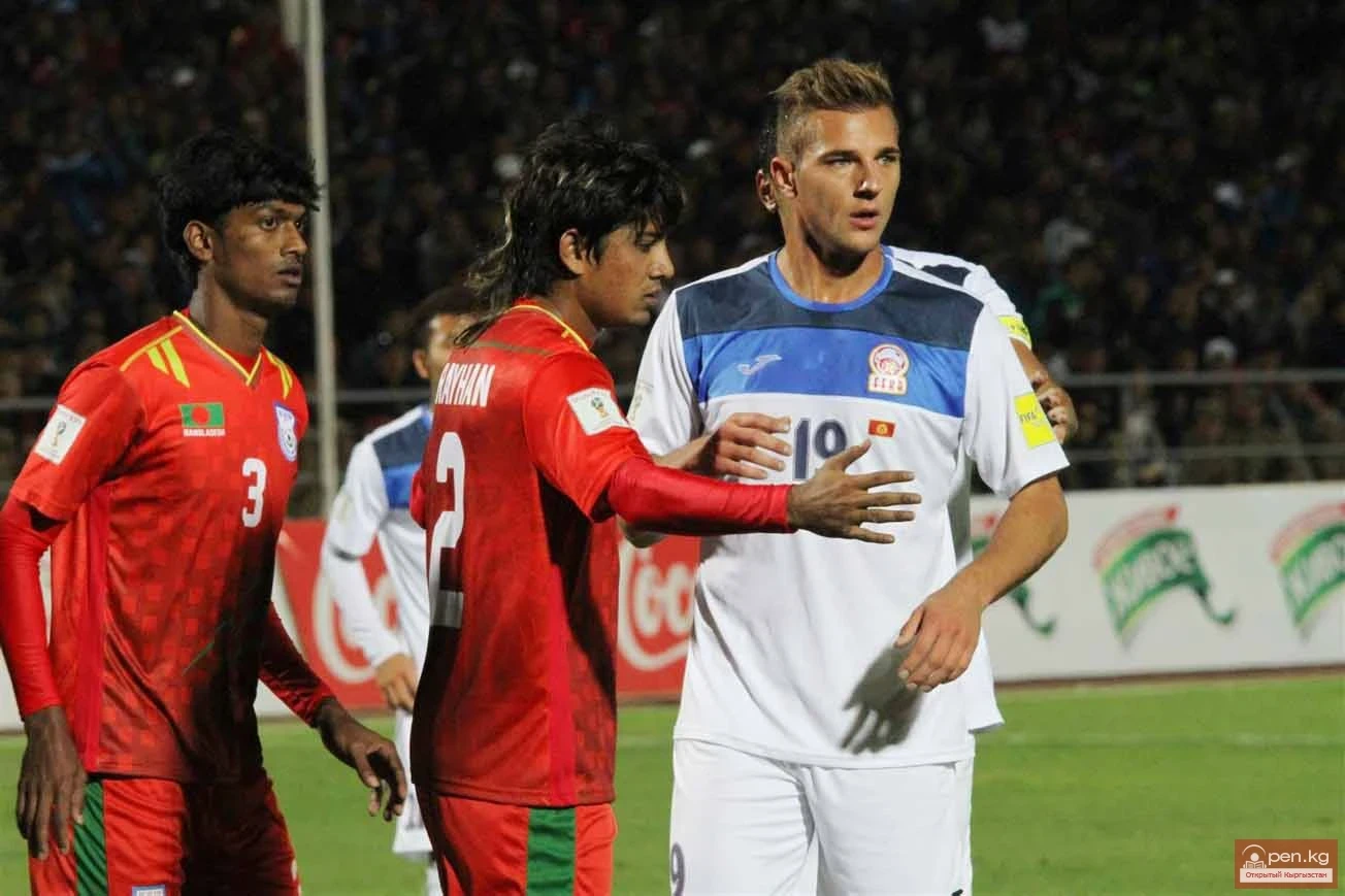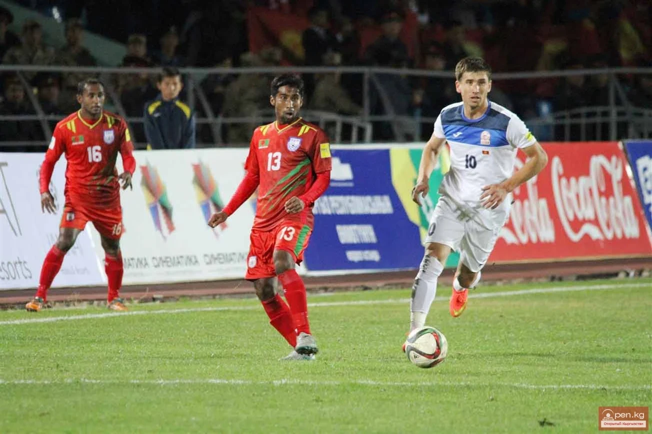 The Kyrgyzstan national team played its fifth match in the World Cup 2018 qualifying campaign on October 13 in Bishkek against the Bangladesh national team. Our team had already managed to defeat this opponent with a score of 3:1 in Dhaka, so the domestic team was set only for victory. Moreover, the opponent's coach noted that it is very unusual for his players to play in cool weather. The following players took the field for Kyrgyzstan: Pavel Matyash, Valery Kichin, Viktor Mayer, Azamat Baymatov, Mirlan Murzaev, Tamirlan Kozubaev, Pavel Sidorenko, Vitaly Lyuks, Farhat Musabekov, Anton Zemlyanukhin, Edgar Bernhardt. Right from the starting whistle, our footballers rushed into the attack. They hardly moved away from the opponent's goal. In the 24th minute, the Kyrgyzstan team earned a free kick, but Valery Kichin shot poorly from a low position. The goal against the opponent was scored in the 27th minute. Vitaly Lyuks finished off a corner kick - 1:0! During the first half, there were many chances to increase the lead, but unfortunately, all were unsuccessful.