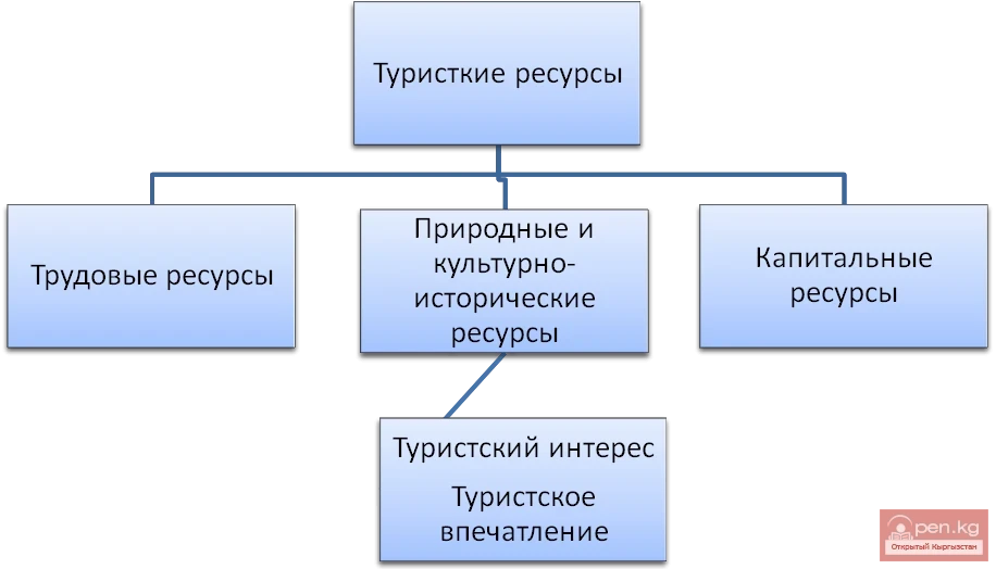Kyrgyzstan, for example, cannot expect to develop space tourism, as it has neither spaceports nor spacecraft; it cannot offer or expect the development of such types of tourism as underwater excursions in warm seas and many other popular types of tourism simply because there are no resources in our country to develop these areas of tourism, and due to natural circumstances, there will never be an opportunity to do so - in simpler terms, there are no corresponding resources.