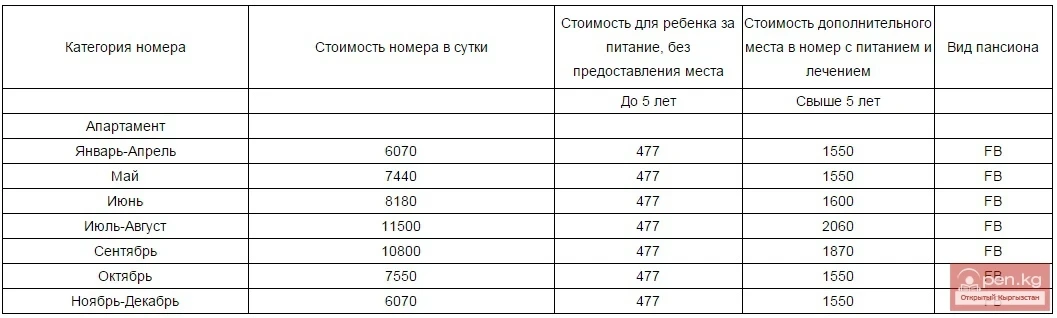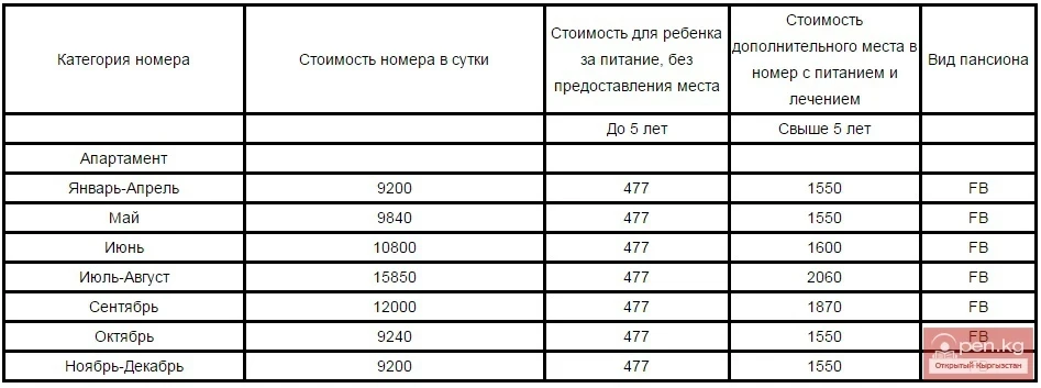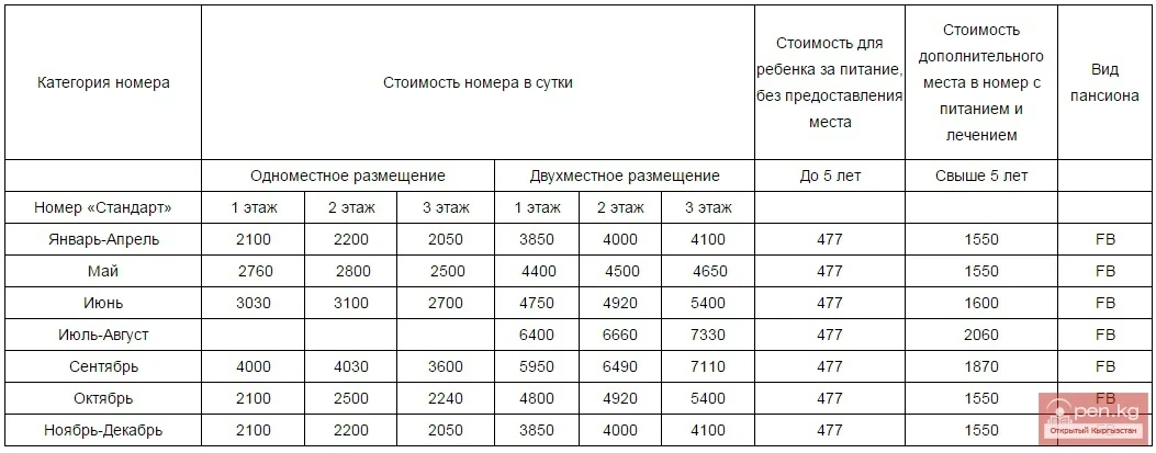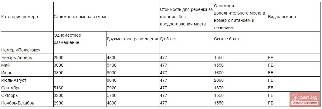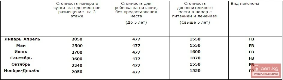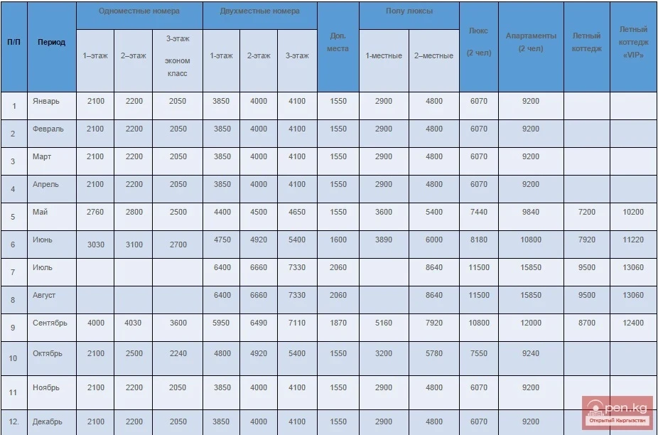 From July 1 to August 31, booking a place for one person costs 250 soms, regardless of the number of days of stay.