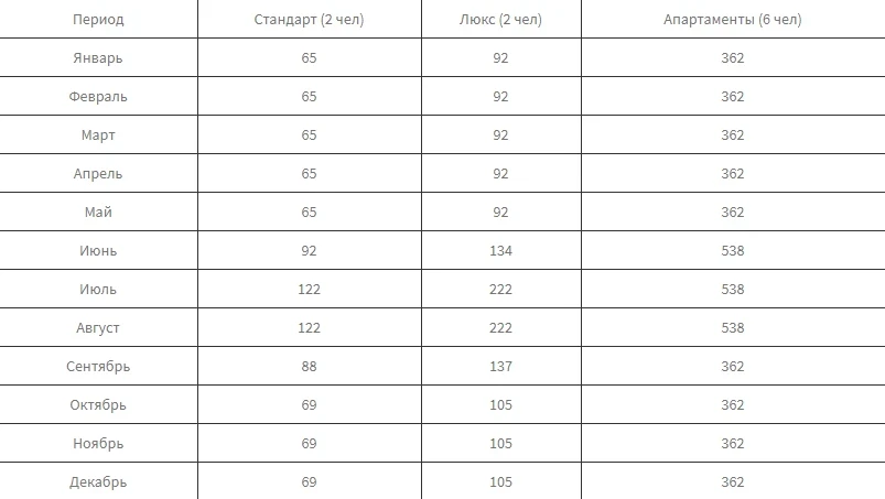 For accommodating guests, the recreation center has 2 buildings. The pansion's room stock includes: luxury rooms – 92 rooms (double, two-room), standard category rooms - 68 rooms (double, one-room), apartments – 2 rooms (two bedrooms, office, living room).