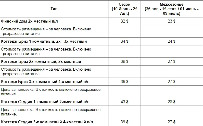Accommodation: Cottages: 1-story Finnish houses, 1- and 2-story studios, 2-story "Breeze" cottages.