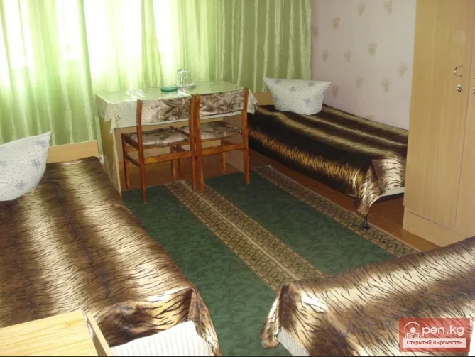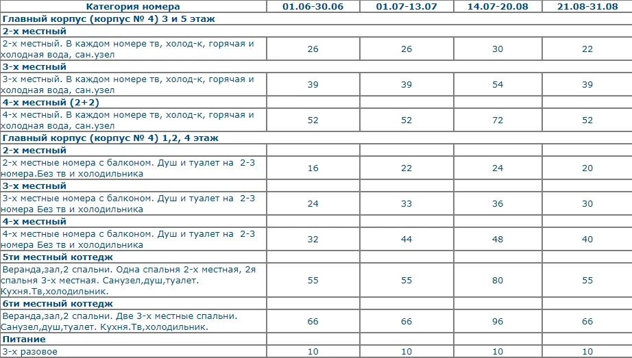The guesthouse consists of a complex of 4 buildings, with building No. 4 being the main one. In total, the guesthouse can accommodate up to 500 vacationers. All buildings of the guesthouse and the beach belong to different owners, so there is no single owner of the guesthouse. Hence, there is a varying level of comfort and service within the guesthouse. Buildings 1, 2, and 3 are of an economy level, with rooms having shared facilities in the hall. The main building is the primary accommodation facility. It is a 5-story building that houses standard and semi-luxury rooms for 2, 3, and 4 guests. Standard rooms do not have TVs or refrigerators, with facilities either in the rooms or in a block for 2+2. Semi-luxury rooms have TVs and refrigerators, with facilities available both in the rooms and in blocks of 2+2. All rooms have separate beds, bedside tables, kettles, and tea sets.