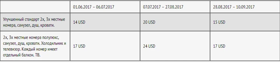 Accommodation: The guesthouse is designed to accommodate over 250 vacationers and consists of 94 rooms located in three buildings. The rooms have a bathroom, shower, sink, hot and cold water. There are rooms with balconies and without. The rooms have undergone cosmetic repairs. They are furnished with solid wooden furniture and comfortable beds. There are televisions and refrigerators. Each room has its own balcony with a wonderful view of the landscaped area and the lake.