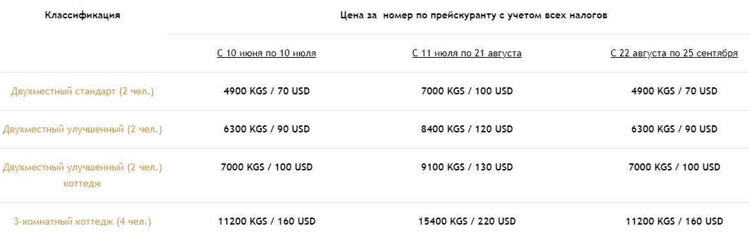 The hotel has 34 standard double rooms, which consist of separate one-story and two-story cottages with two to four rooms in each. The hotel operates according to modern European standards. The rooms are designed in a modern yet calm style: light wood, soft tones, handmade carpets in the Kyrgyz national style, and paintings.