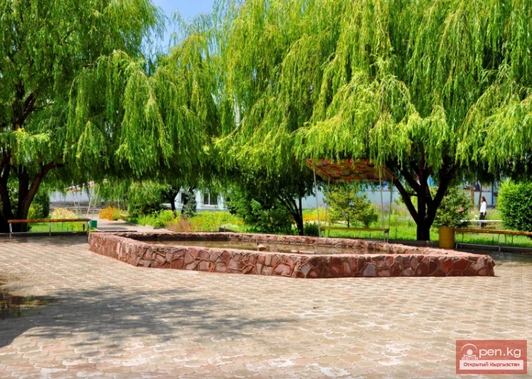 The tourist complex is located in a park area, literally surrounded by greenery: fir trees, birches, and willows lean over narrow tiled pedestrian paths, flowers are planted along the alleys, a small fountain is flowing, and benches with sunshades are placed around.