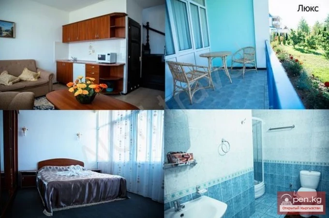 The "Luxury" category rooms are located in a separate building. The rooms are two-level and two-room with a beautiful view of Issyk-Kul. The distance from the building to the beach is 50 m. On the first floor, the room features a living room with soft furniture, a TV, a mini-kitchen (equipped with dishes), a refrigerator, a microwave, and an electric kettle. There are two bathrooms in the room. A balcony with a table and chairs.