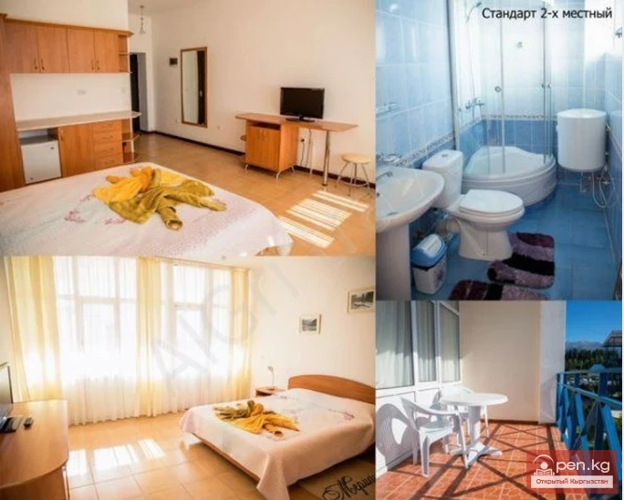 The "Economy" category rooms are located in a three-story building on the 2nd and 3rd floors, without balconies. All double rooms have a view of Lake Issyk-Kul, while three-person rooms have a view of the mountains. The distance from the building to the beach is 50 m. In double rooms, there are two single beds or one double bed (DBL or Twin). In three-person rooms, all beds are single (Triple). The room includes a wardrobe and bedside tables. The bathroom is equipped with a set of towels and soap. Showers are located on the floor. The rooms have a TV, electric kettle, and dishes.