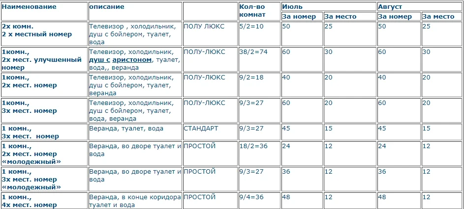 The accommodation consists of one-story buildings with rooms of various comfort categories, ranging from the simplest and most economical tourist category to comfortable rooms with modern infrastructure. The pension has 260 places.