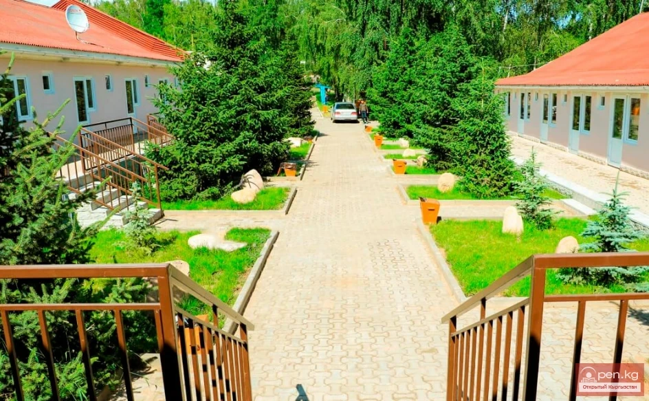 Located in the resort area of Lake Issyk-Kul, in the settlement of Korumdu (25 km from the city of Cholpon-Ata, 274 km from the city of Bishkek). The territory is landscaped with perennial birch and spruce alleys, flower beds, and a fruit garden. The unique mountain-sea climate and the refreshing coolness of the purest water create an unparalleled microclimate.