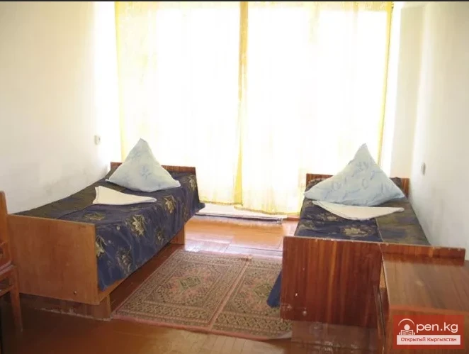 The recreation center can accommodate 550 people. The territory of the boarding house has 40 well-equipped wooden cottages. Each cottage consists of 6-10 rooms, accommodating 2 or 3 people. Each room has a separate entrance. Two adjacent rooms share a toilet and a washbasin with cold water. The Cholpon-Ata Recreation Center has two solar showers and a hot shower, a hygiene room, and an ironing room (free of charge daily).