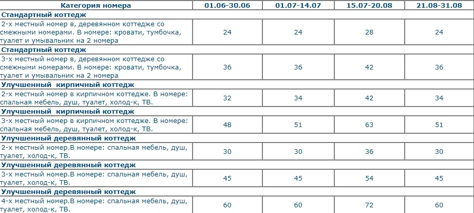 The recreation center has a capacity of 960 places. On its territory, there are 48 wooden standard cottages of Baltic type and 4 improved brick cottages, lined with wood inside. All rooms accommodate 2, 3, or 4 people.