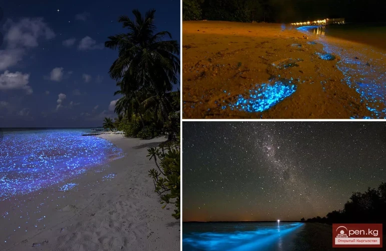 Visitors to Vaadhoo Atoll can witness a true wonder of nature. Here, under the cover of night, the boundary between the sea and sky blurs. When the sun sets, not only does the sky sprinkle with a million bright stars, but the sea ignites with countless tiny blue lights. This phenomenon is called bioluminescence and occurs as a result of a reaction of phytoplankton that inhabit these waters to oxygen. Thanks to these microorganisms, the entire beach and coastal waters are illuminated with a soft and romantic glow. This cosmic beauty creates an unforgettable impression.